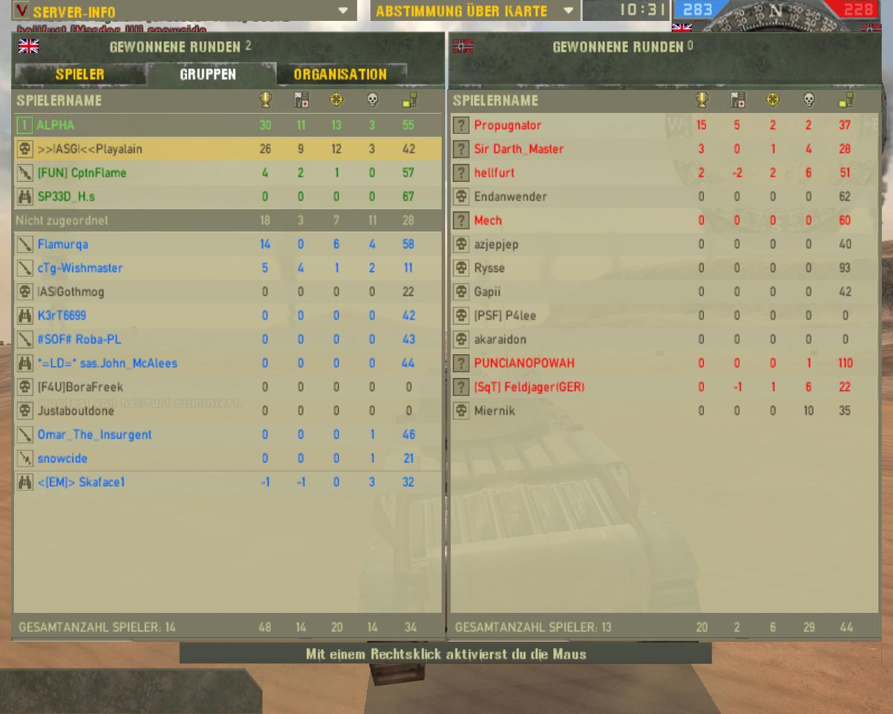 Also, wie eigentlich fast immer ist unser Server leider mal wieder mit 60 Leuten abgekackt. Irgendwie haben wir immer das Pech so fern mal was los ist kacken die Server ab.