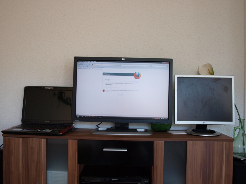 Die Auflösung auf den Bildern ist nicht die korrekte, nur war der Monitor am Laptop zum Fernsehen angeschlossen, und der Lappi schafft diese Auflösung nicht. Zum Vergleich der Größe habe ich meinen 19" TFT danebengestellt sowie den Laptop, der ein 17" Display hat.